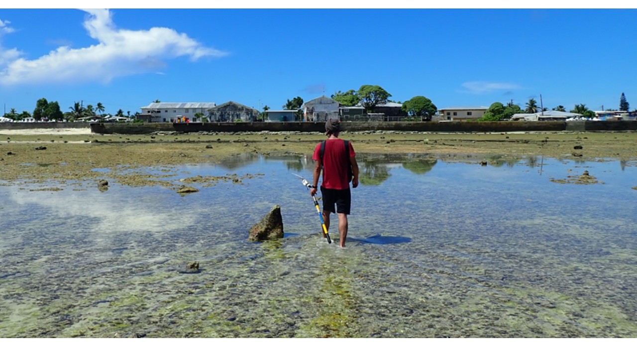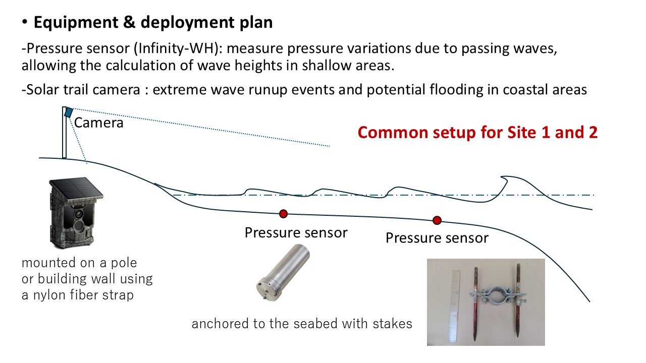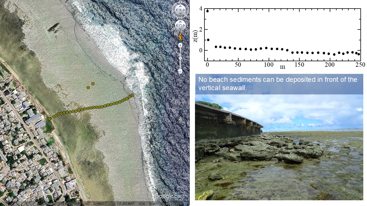 November 1, 2024 Researcher Shimozono installed a wave height meter and a solar-powered camera for wave observation on the east coast of Majuro and continued to observe oceanographic conditions until February 2025. Image of the wave height meter setting of wave camera Topographic survey (1) Topographic survey (2)